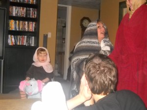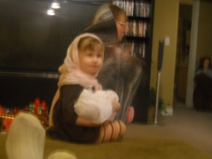 No rocking or stick horse in the stable; so our traditional understudy for Mary’s donkey is the little blue elephant! And that is NOT the old hag from Snow White fame begging to rent a room from the “GRUMPY(?)” innkeeper, played by our sweet Taylor. It’s yet another understudy, rather a pathetic one, who stepped in to play the part of Joseph at the last moment.