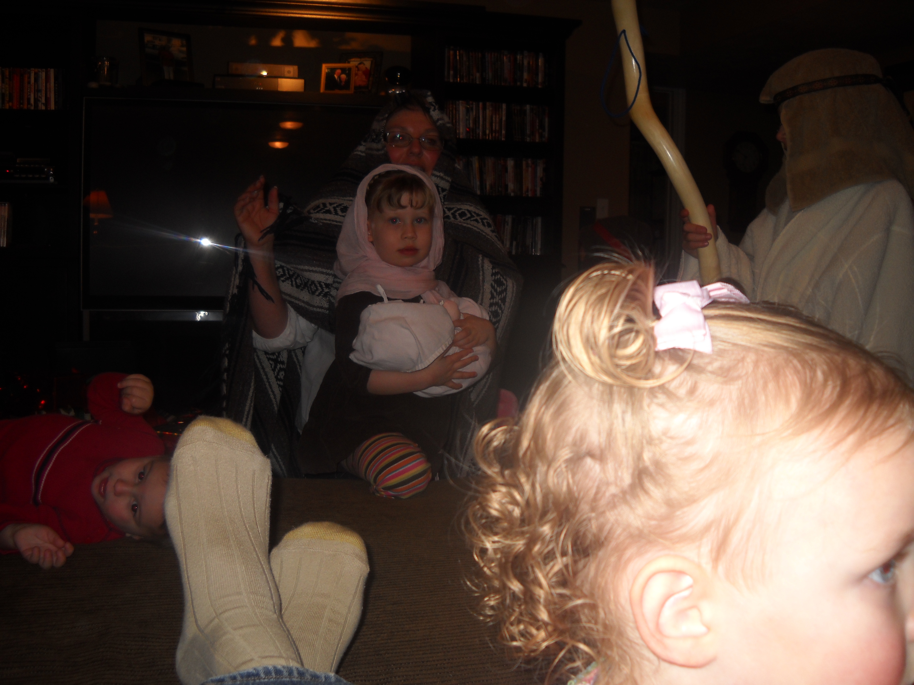One-year-old Maegan, made a surprise appearance as the angel. Until I saw this photo, I thought our play was angel-LESS because 3-year-old Mia opted to be a shepherd instead. Maegan needed no costume as her golden curls created the perfect halo!