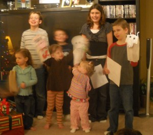 For the finale, 7 of the 10 grandchildren reminded the audience that animals also honored the Christ Child. The older ones recited the traditional English carol, “The Friendly Beasts,” while the little ones waved paper-sack puppets around and around and around!