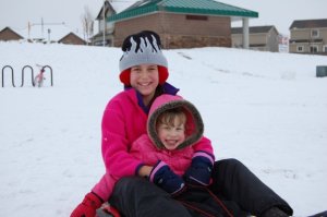 Here come the GIRLS! Our Abby was courageous as she maneuvered the sled, safe in the arms of her big-girl cousin Taylor!