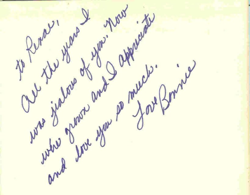 After the poetry readings of Bonnie’s work, she signed copies of her book during the reception honoring her. I waited in line to hug and kiss her and to get my autographed copy. We exchanged warm greetings; I offered my warmest congratulations to her, and told her how very proud I was of this tremendous accomplishment .  I remember Bonnie absolutely glowed in the joy of that evening. Finally, she picked up the book,  scribbled a short message, and hugged me again as she handed the copy to me. I didn’t immediately read what she wrote, but when I looked over the inscription, her words startled me.