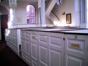 Closer look at the enclosed pews. Colonists "bought" these, and the richest families purchased the most central ones. They decided size by the number of members in their families. The pews were enclosed to keep Church-goers warmer in the UNheated sanctuary!