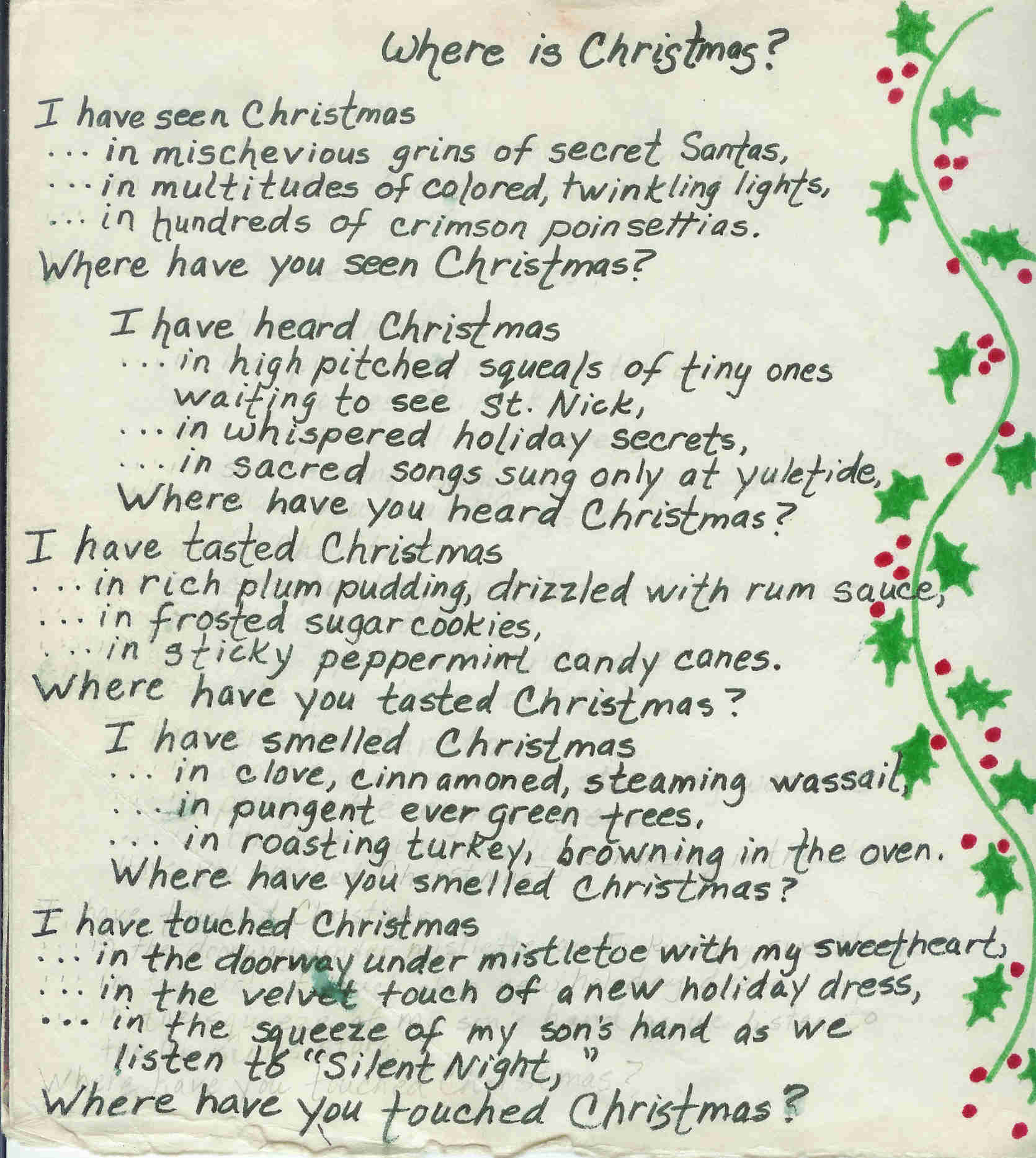 3. “Where is Christmas?” is a sensory poem that incorporates images evoked by the 5 senses: sight, audio, taste, smell, and touch. “Formula poets” can use this format for ANY subject. For instance, when I taught in Georgia, I assigned my students to write this kind of poem about the Peach State. And I’ve worked with other kids in creating sensory images about Halloween and autumn. Anyway, you get the point. It’s really quite fun.
